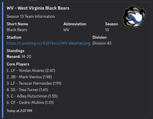 The layout of the /team embed is just not "pretty". There is a lot of blank space. The division name isn't displayed. We display a raw URL for the stadium. Let's take a UI-upgrade pass at this.